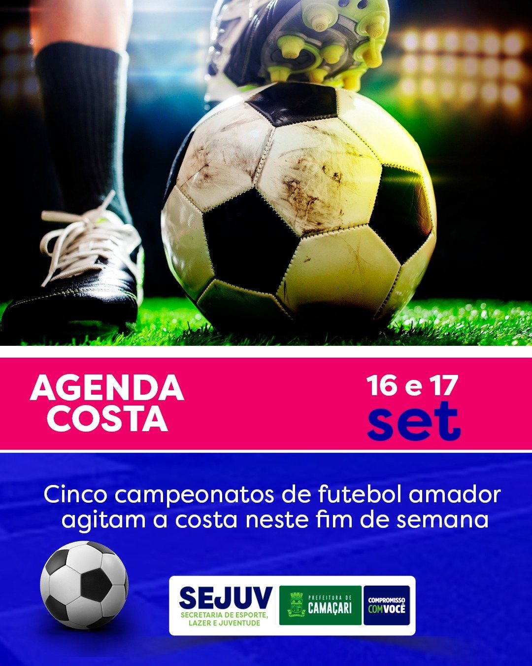 Mais um fim de semana repleto de opções para os amantes do futebol amador. Com apoio da Prefeitura de Camaçari, através da Secretaria do Esporte, Lazer e Juventude (Sejuv), neste sábado e domingo (16 e 17/9) acontecem rodadas nas localidades de Abrantes, Areias e Barra do Pojuca, na costa. E nos bairros Mangueiral, Burrissatuba, 2 de Julho, Novo Horizonte e Estádio Municipal Fernando Ferreira Lopes, na sede.