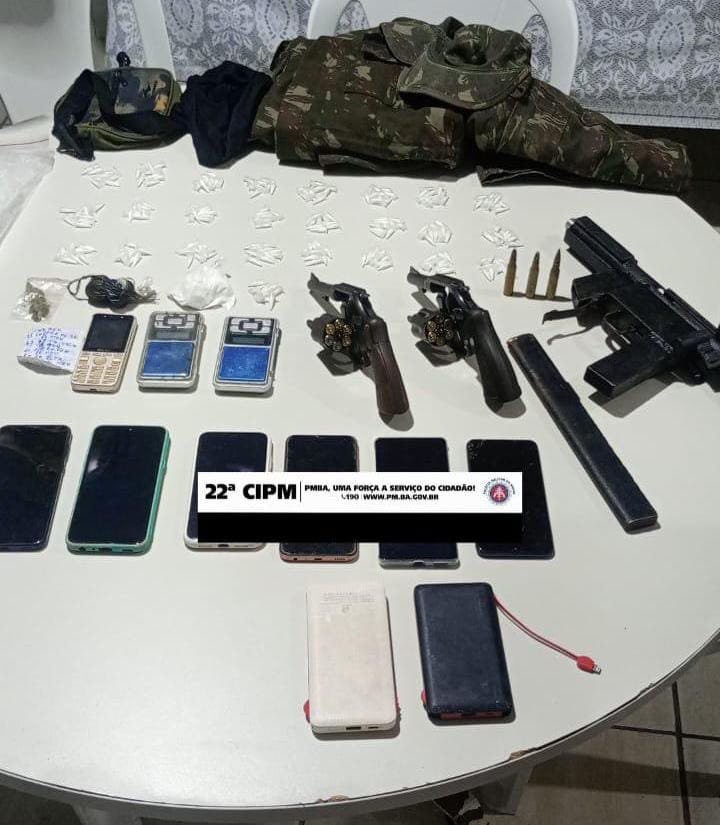 Com o trio foram apreendidos uma submetralhadora calibre 9mm, dois revólveres calibre 38, carregadores, munições, roupas camufladas, porções de maconha e cocaína, balanças e celulares.