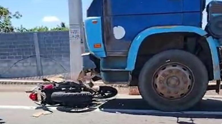 Imagens feitas por testemunhas mostram a motocicleta embaixo do caminhão após a colisão. O condutor também foi atingido pelo veículo maior. O jovem teve o braço direito decepado no acidente.