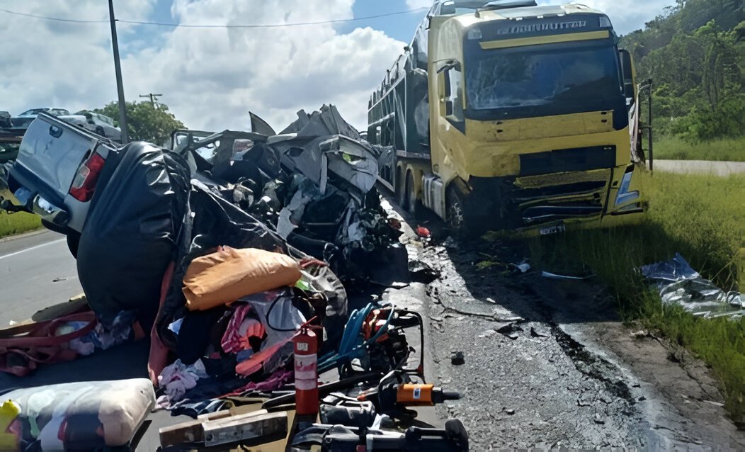 Foto: PRF-BA / Um homem morreu e outro ficou gravemente ferido depois que um caminhão-cegonha fez uma ultrapassagem e bateu de frente com uma caminhonete, na manhã deste sábado (15), na BR-101, em Alagoinhas, a 78 km de Feira de Santana. O acidente, que aconteceu por volta das 5h40, foi registrado por uma câmera de segurança. Nas imagens, dá para ver que o motorista do veículo menor até tenta desviar, mas não consegue a tempo. Segundo informações da Polícia Rodoviária Federal (PRF), a vítima que morreu no local era o…