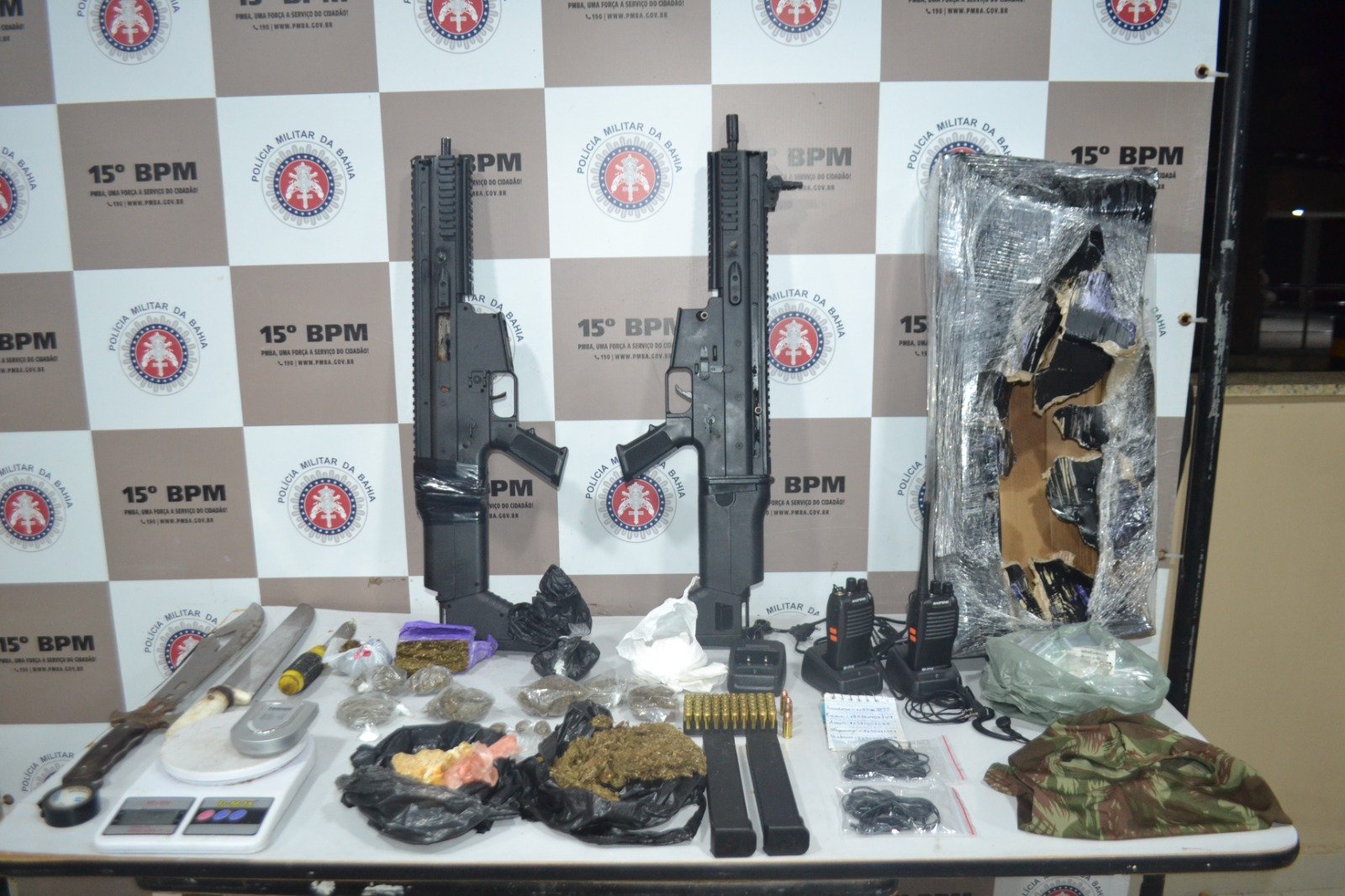Foto: Divulgação/ Polícia Militar – DCS/ Policiais do 15º BPM apreenderam duas submetralhadoras e drogas, no bairro de Maria Pinheiro, em Itabuna, na tarde de sexta-feira (5). Os pms participavam da Operação Garra de Arquimedes, quando receberam uma denúncia de tráfico de drogas. Ao chegarem ao local, área de mata, foram encontradas duas submetralhadoras calibre 9mm, 550 gramas de maconha, 200 gramas de cocaína, 200g de crack, 57 munições calibre 9mm, dois rádios comunicadores, três carregadores de rádio comunicadores, três balanças de precisão, três facas e uma balaclava. Os suspeitos…